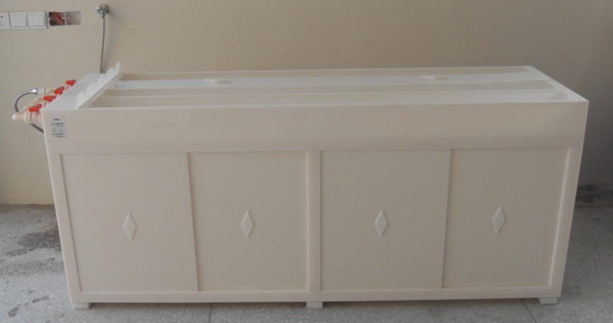 結構材質(zhì):槽體:采用PMMA樹(shù)脂板材吸塑成型、抗壓強度高、耐腐蝕易清潔、對人體無(wú)毒,不磨損鏡體表面。下柜:采用板材組裝。閥門(mén):采用陶瓷芯片全銅閥門(mén),配備高壓水槍接頭。可根據使用單位要求配置方槽、立槽數量。
